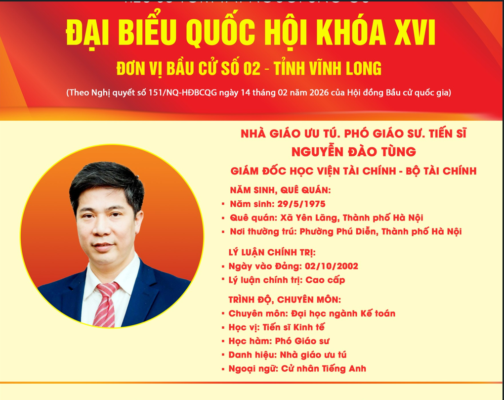 (HVTC) - Ngày 02/3, tại các trụ sở UBND phường Bình Minh và UBND phường Đông Thành tỉnh Vĩnh Long, Ban Thường trực Ủy ban Mặt trận Tổ quốc Việt Nam tỉnh Vĩnh Long tổ chức hội nghị tiếp xúc giữa cử tri với những người ứng cử đại biểu Quốc hội khóa XVI tại đơn vị bầu cử số 2. Cùng với 04 ứng cử viên khác ứng cử đại biểu Quốc hội khóa XVI tại tỉnh Vĩnh Long, NGƯT.PGS.TS.Nguyễn Đào Tùng, Giám đốc Học viện Tài chính đã gặp gỡ, “lắng nghe cử tri, theo đến cùng các kiến nghị chính sách”.