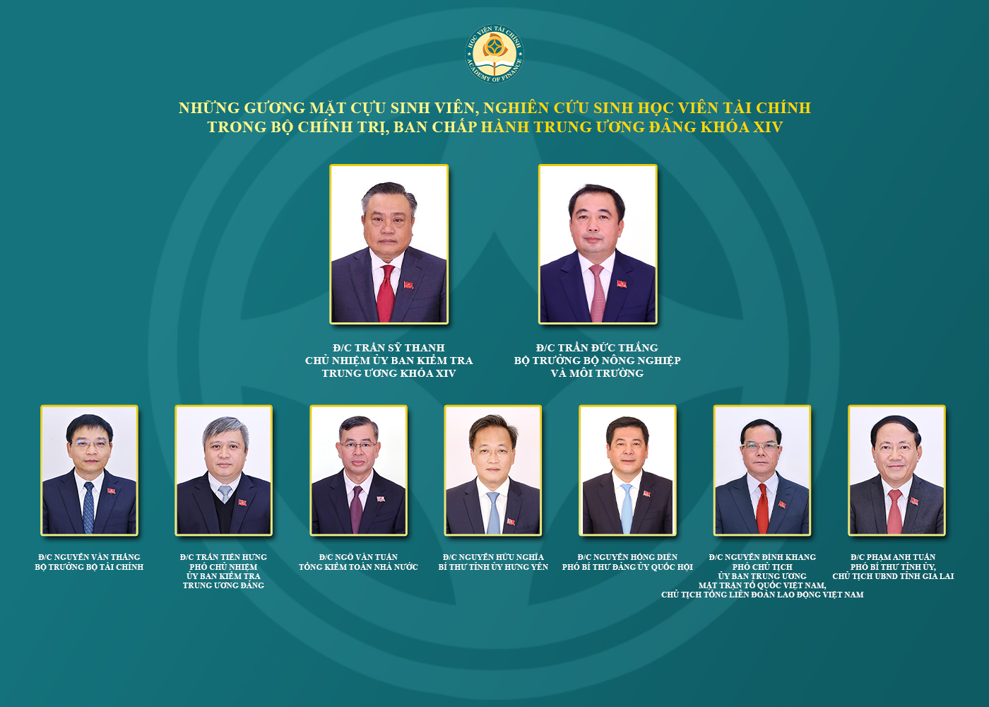 (HVTC) - Ngày 22/01/2026, Đại hội đại biểu toàn quốc lần thứ XIV của Đảng đã bầu Ban Chấp hành Trung ương Đảng khóa XIV gồm 200 đồng chí (180 Ủy viên chính thức và 20 Ủy viên dự khuyết). Tự hào trong số đó có 09 đồng chí là cựu sinh viên và nghiên cứu sinh Học viện Tài chính, đặc biệt có 02 Ủy viên Bộ Chính trị và 07 Ủy viên Trung ương Đảng.