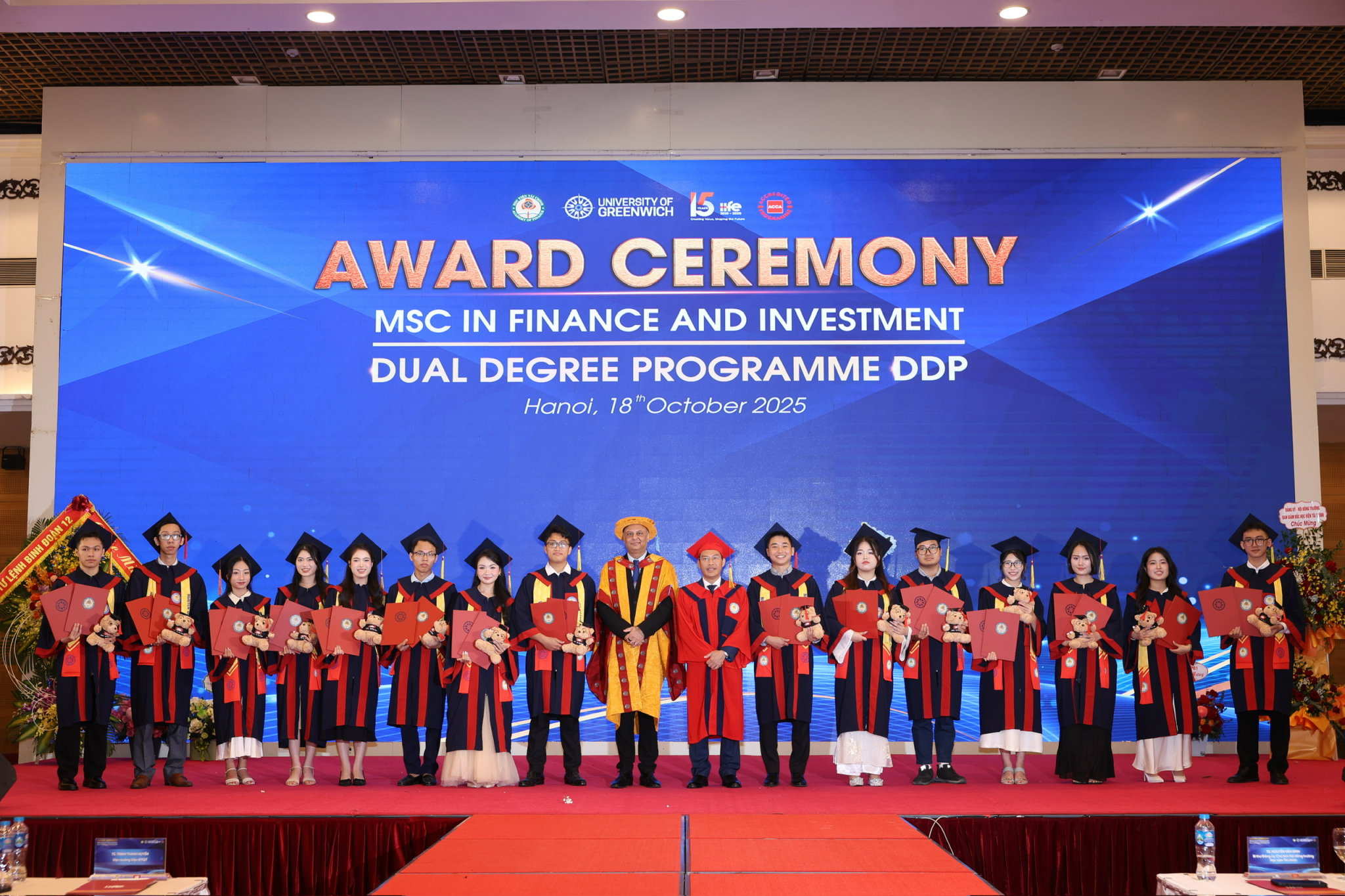 Sáng ngày 18/10/2025, tại Trung tâm Hội nghị Quốc tế (37 Hùng Vương), Viện Đào tạo Quốc tế – Học viện Tài chính đã long trọng tổ chức Lễ Trao bằng Tốt nghiệp năm 2025 cho 132 Tân Cử nhân chương trình LKĐT Mỗi bên cấp Một bằng Cử nhân (DDP) và 12 Tân Thạc sĩ chương trình Thạc sỹ Tài chính và Đầu tư (MSc).